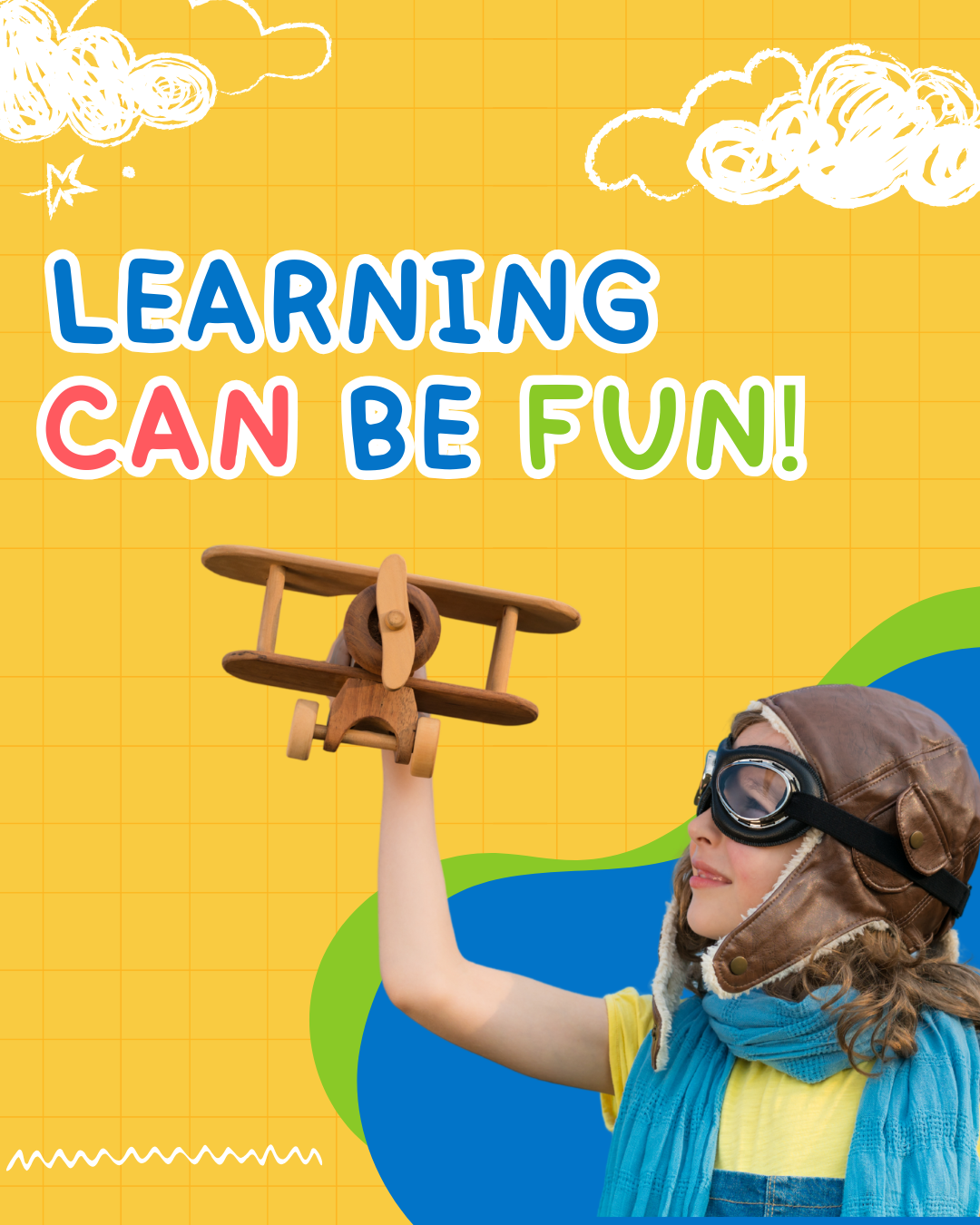 Child holding a toy airplane with 'Learning Can Be Fun!' text on a yellow background